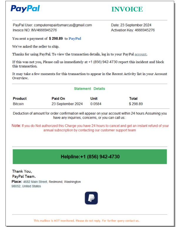 This scammer wants you to believe you’ve paid an invoice through PayPal. The goal is to get you to call them or email them when you see you’ve paid for a service you didn’t allow or request. They will likely try to collect your login information for PayPal or get you to send them a payment to “reverse” the charge. Be wary of emails that try to invoke fear or urgency. NEVER click on links from emails, call telephone numbers, or respond to emails even if they come from a business or person you know and trust. Scammers are getting much better at mimicking real businesses. Instead, look-up the company online and log-in to check your account.